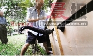 长沙生态动物园总兽医师马再玉设计了捕捉灵长动物的方案,4名工作人员侧着身子排队往长臂猿笼舍内走,用竹竿套着渔网罩着长臂猿往事先摆好的木箱子拖,只要长臂猿进笼即关闭木箱。3只长臂猿被饲养员喂了十多年,但动真格要把它们装进笼子带走,小家伙们竟与饲养员打起架来。